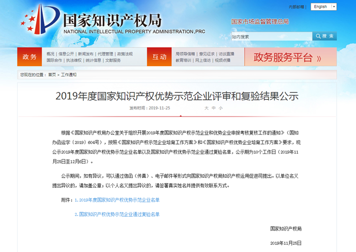国家知识产权示范企业是国家对企业知识产权创造、运用、保护、管理等方面工作突出授予的最高荣誉,也是国家给予企业知识产权管理工作的最高评价。通过评审的企业将作为地区知识产权发展的领头羊,为知识产权发展提供有力支撑。