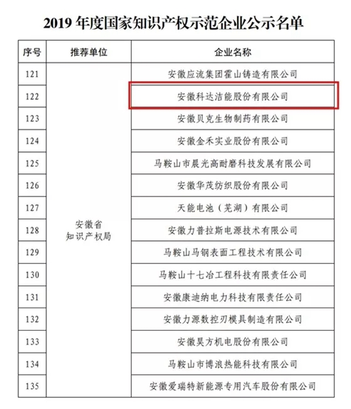 安徽科达洁能获评2019年度国家知识产权示范企业