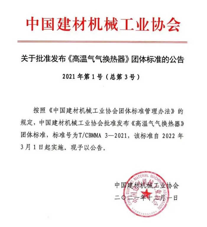 近日,中国建材机械工业协会发布公告,由安徽科达洁能股份有限公司、清华大学山西清洁能源研究院等主要负责起草的T/CBMMA 3—2021《高温气气换热器》团体标准获批发布,自2022年3月1日起实施。