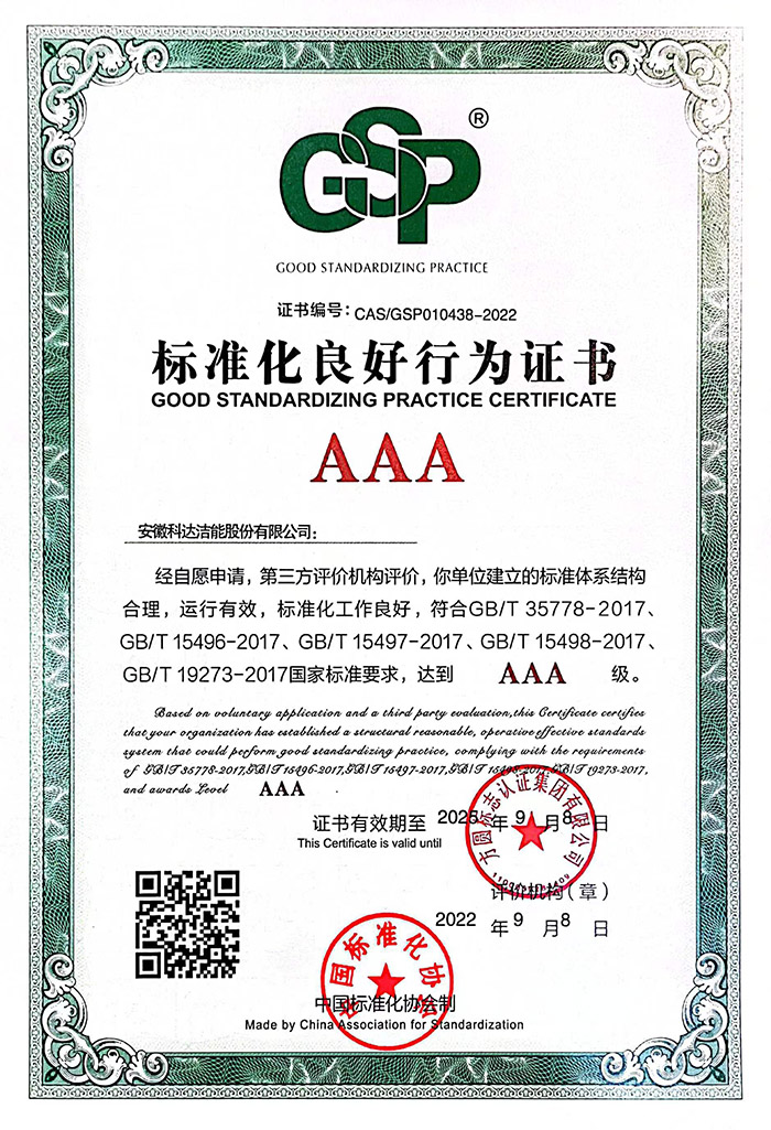 近日,安徽科达洁能股份有限公司顺利通过中国标准化协会认定,成功获得国家级标准化良好行为AAA级证书。